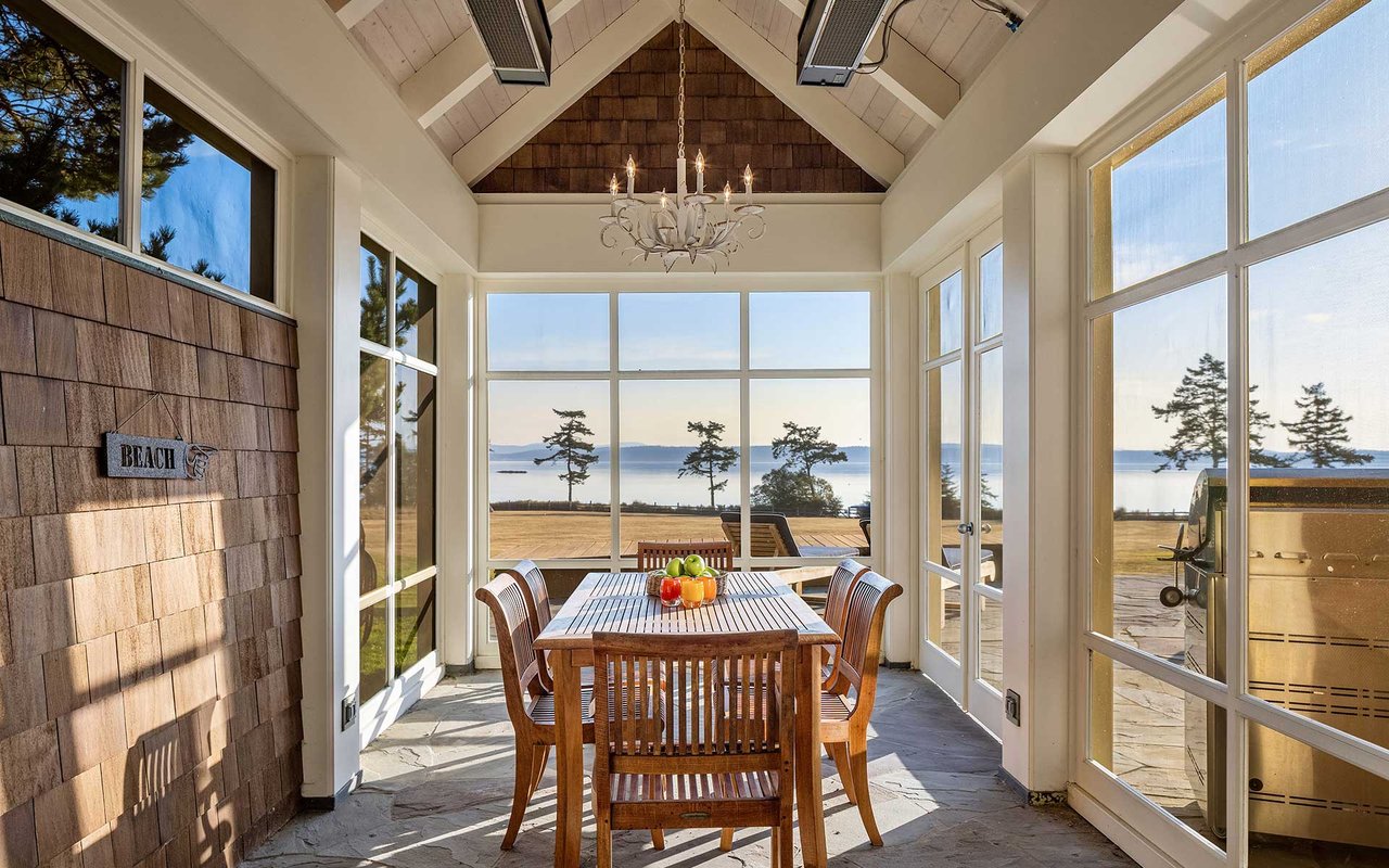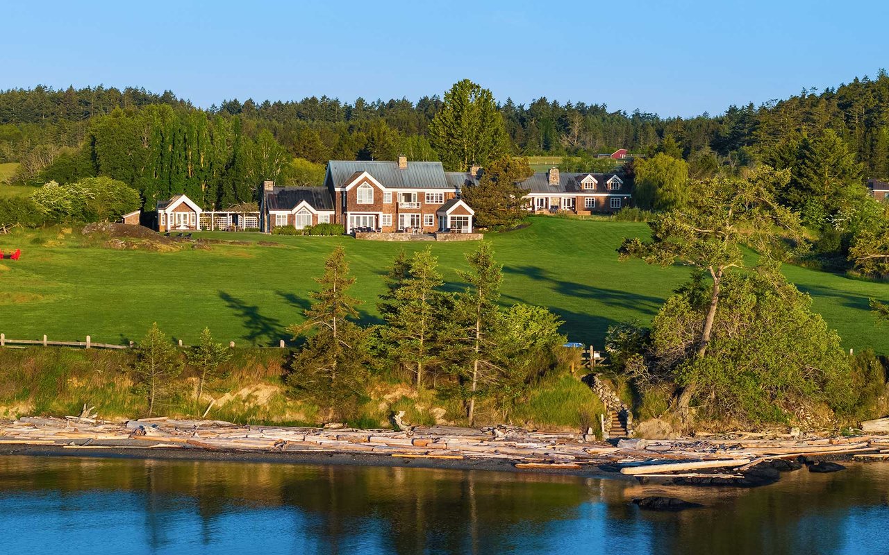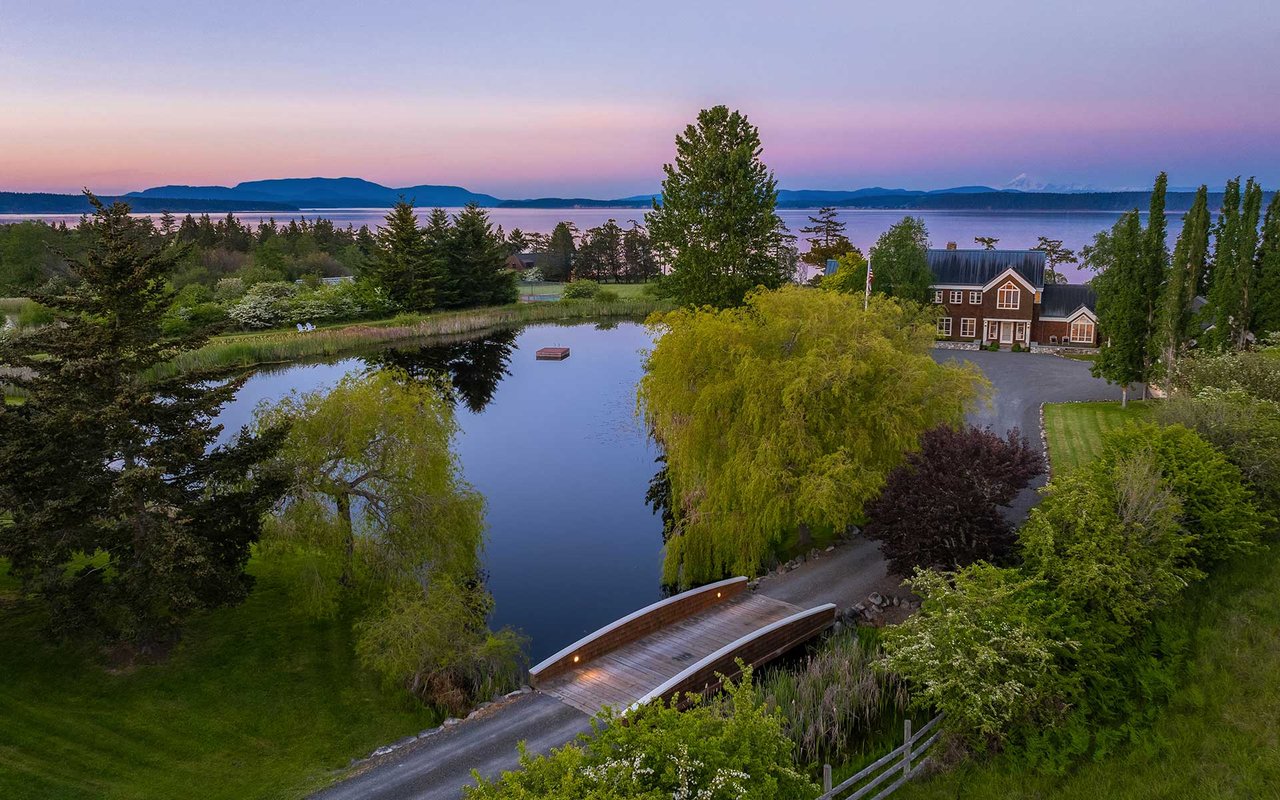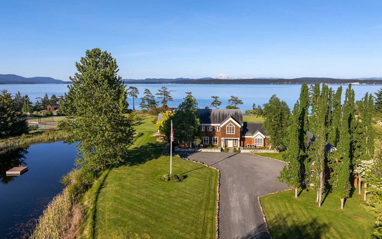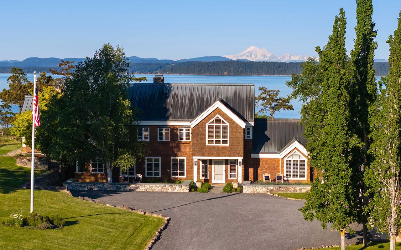 Soaring spaces and rich finishes define The Farm House, sited on 284 ft of waterfront + mooring buoy with sweeping Salish Sea and Mt. Baker views. Expansive terraces and patios (w/hot tub) for endless enjoyment of this serene and private estate. A great room with floor-to-ceiling rock fireplace is ready for hosting gatherings in beautiful coastal style. The chef's kitchen boasts two islands and accommodates several cooks. Primary suite with exercise room and dual baths, home office, private pool & spacious 3-car garage. The adjacent cottage offers a lovely, private retreat for guests. Commercial-grade buoy. Includes access to Halftide Farms amenities including a second pool, tennis + pickleball courts & game house. This is Halftide Living.