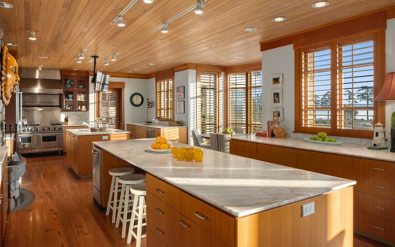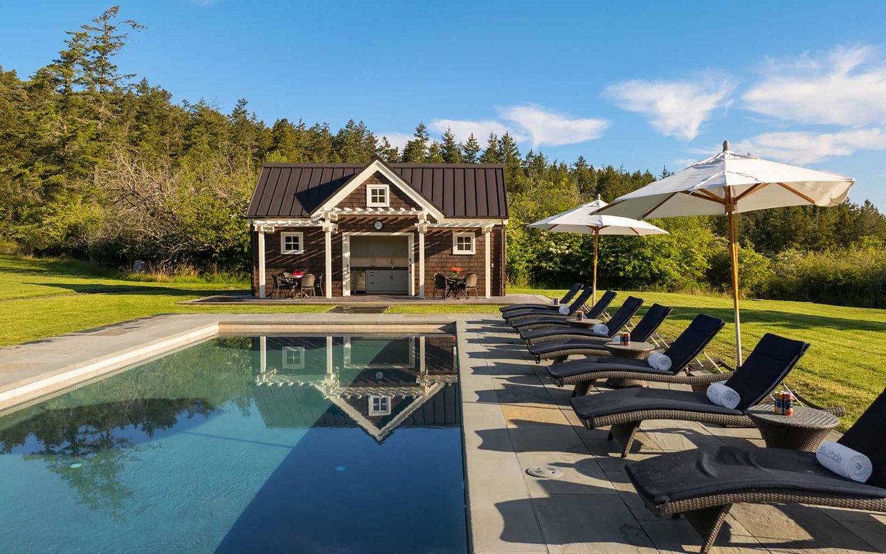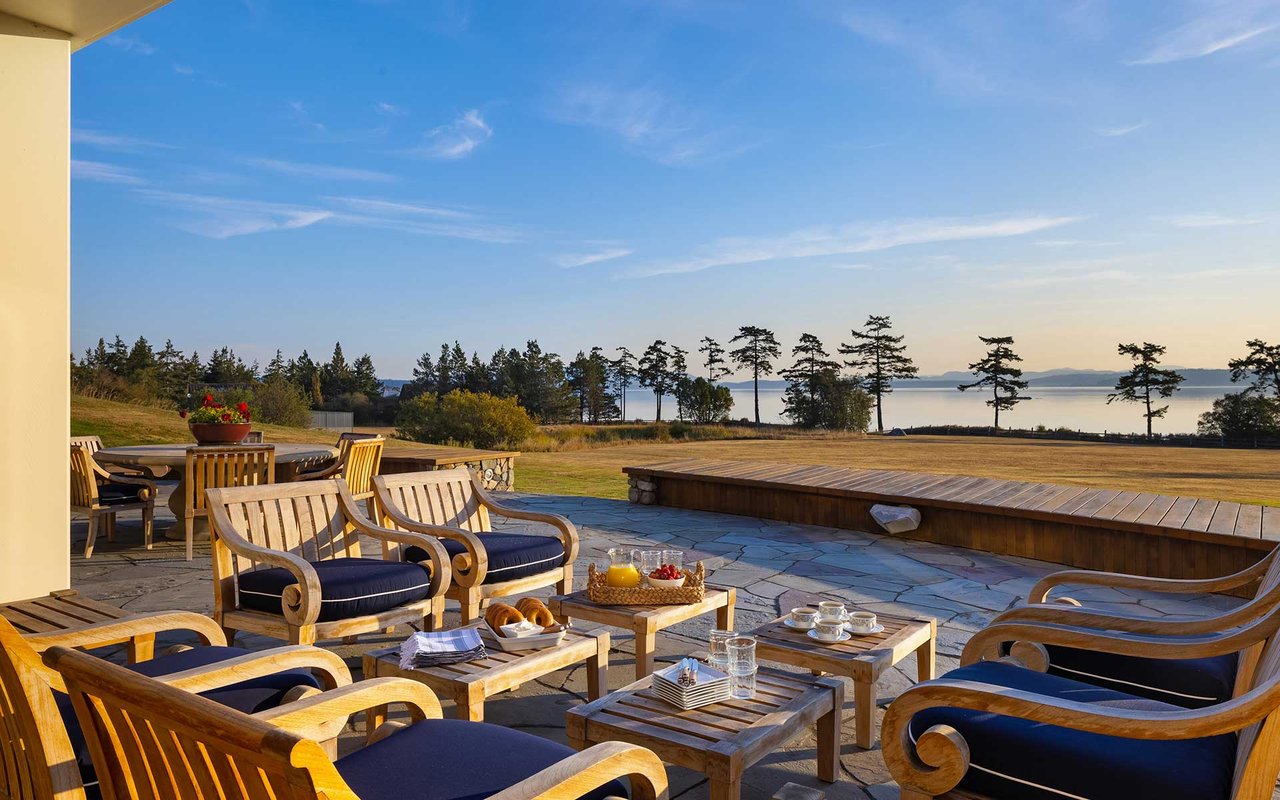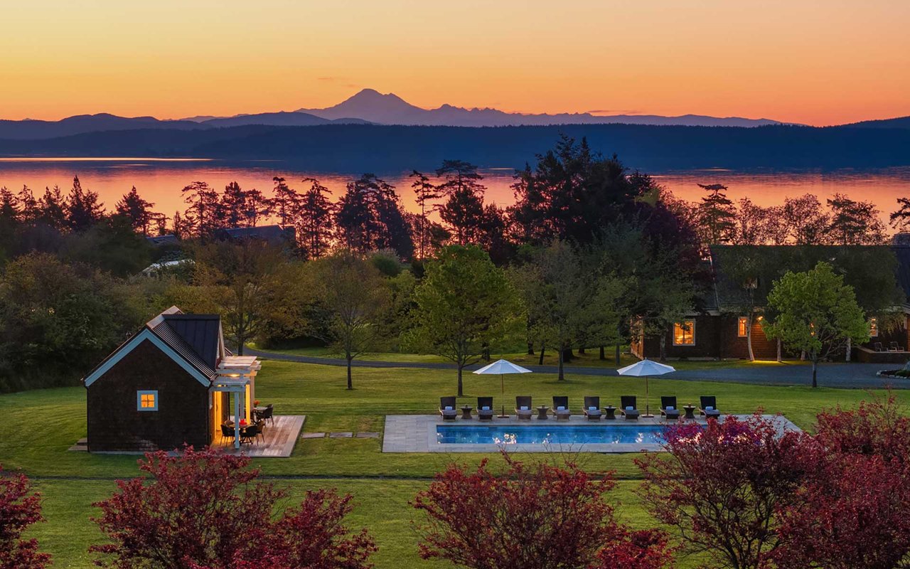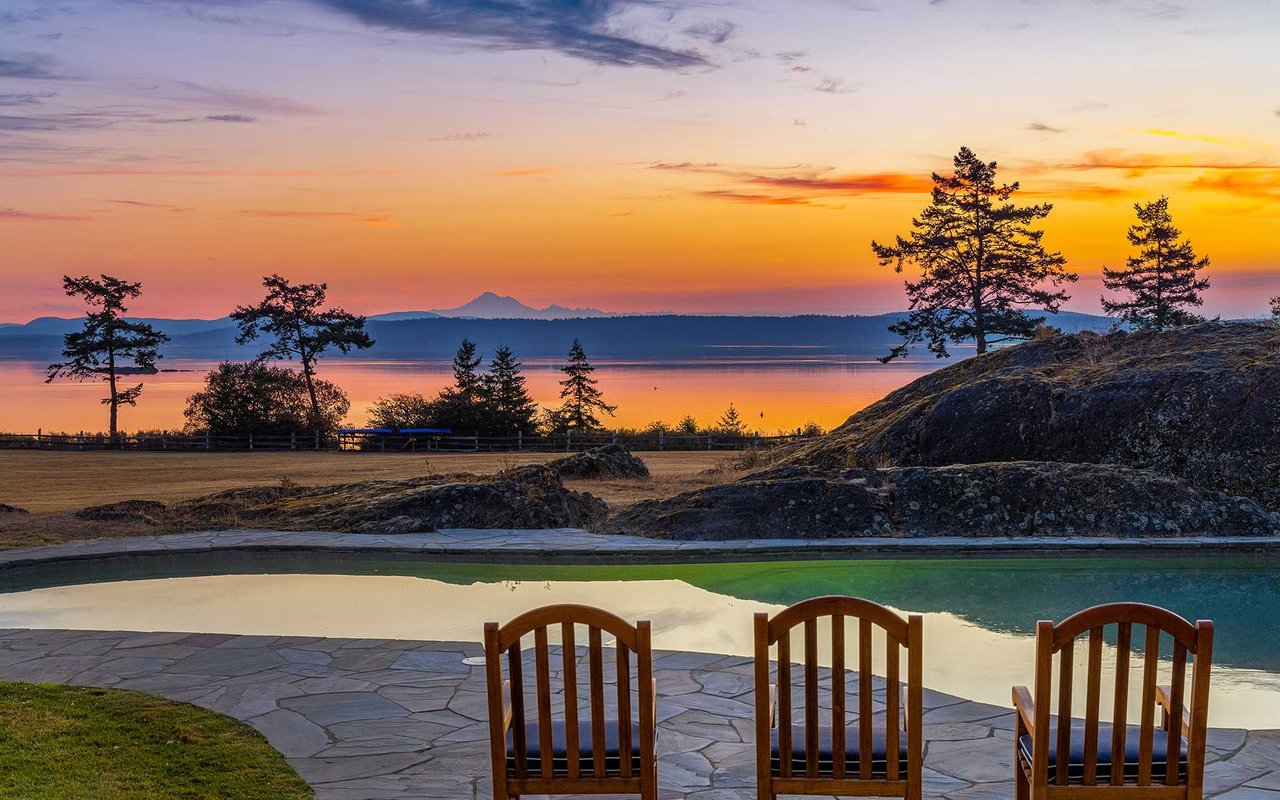 Soaring spaces and rich finishes define The Farm House, sited on 284 ft of waterfront + mooring buoy with sweeping Salish Sea and Mt. Baker views. Expansive terraces and patios (w/hot tub) for endless enjoyment of this serene and private estate. A great room with floor-to-ceiling rock fireplace is ready for hosting gatherings in beautiful coastal style. The chef's kitchen boasts two islands and accommodates several cooks. Primary suite with exercise room and dual baths, home office, private pool & spacious 3-car garage. The adjacent cottage offers a lovely, private retreat for guests. Commercial-grade buoy. Includes access to Halftide Farms amenities including a second pool, tennis + pickleball courts & game house. This is Halftide Living.